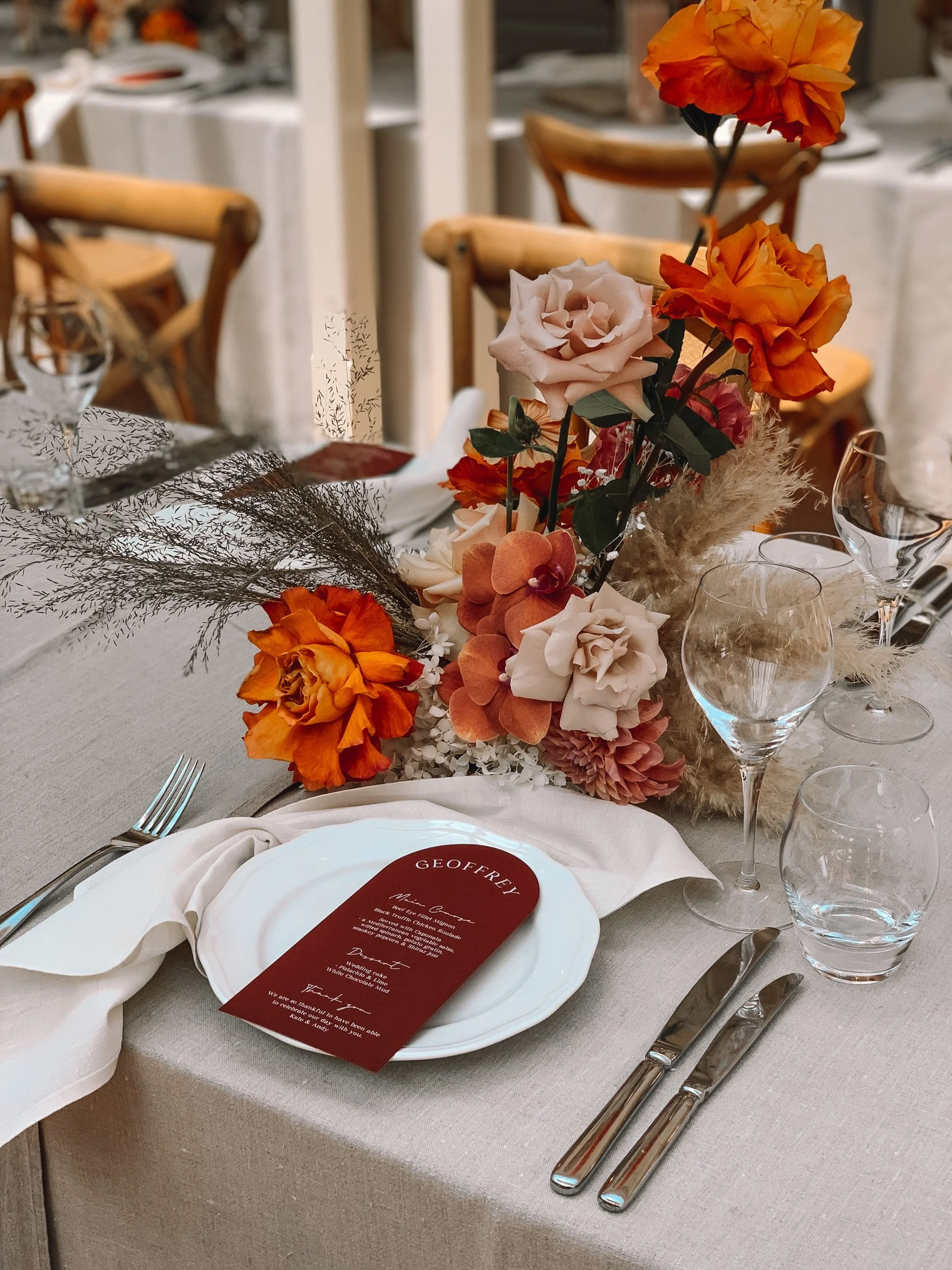 It was such an honour to work on the wedding stationery for my sister Kate and her new hubby Andy! We created some beautiful stationery that was classic, yet modern. Kate’s colour palette was so beautiful. The menus we created reflected the burnt burgundy colour that was emulated throughout the florals on the day.